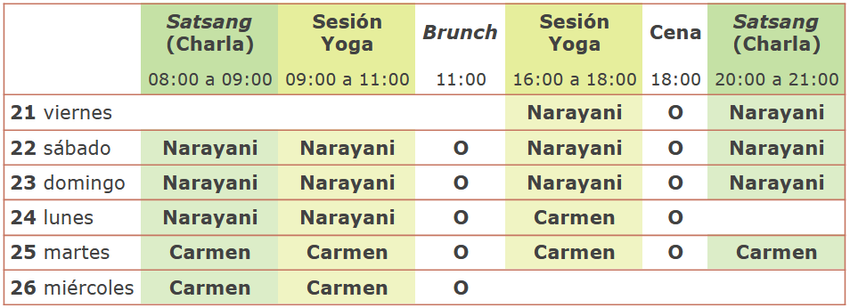 Se desarrollará en dos etapas. Del 21 al 24 de agosto, hasta la hora del brunch, las sesiones estarán a cargo de Narayani. Y a partir de la tarde del 24 y hasta la finalización del seminario continuará Carmen León.